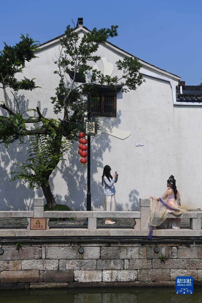 6月14日,身著(zhù)傳統服飾的游客在織里鎮義皋古村落拍照留影。