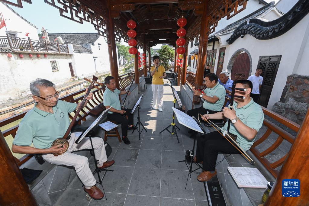 6月14日,織里鎮義皋古村落的居民在排練戲曲。