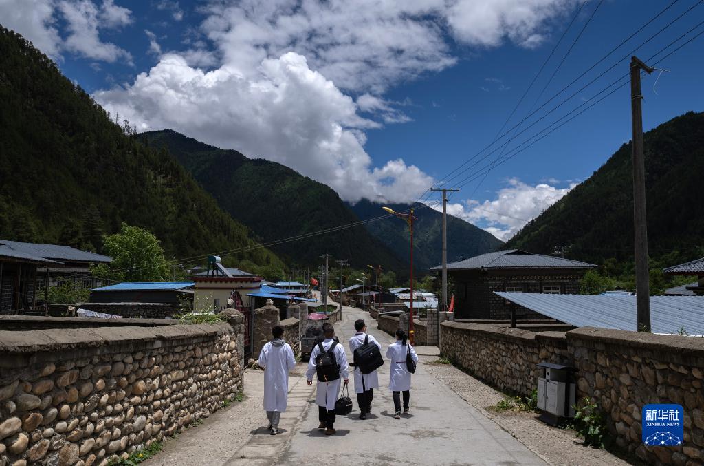 6月12日,入戶(hù)診治結束后,王振疆(左二)、王彤旭(右二)、陳冰(右一)和尼瑪益西走向村委會(huì )。