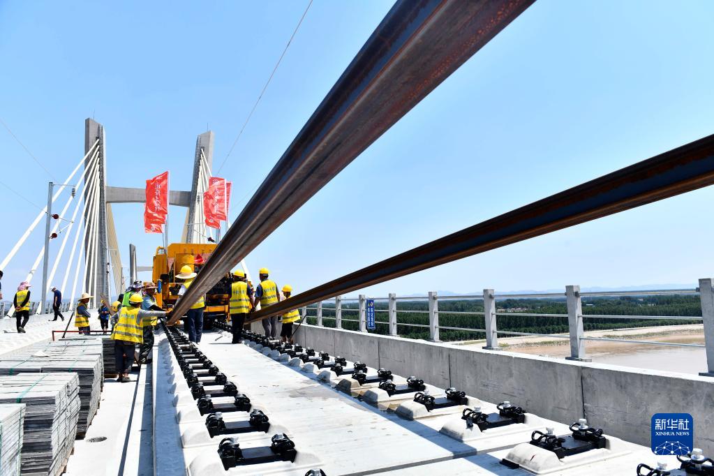 6月14日,在濟鄭高鐵山東段長(cháng)清黃河特大橋,中鐵十局的工作人員進(jìn)行鐵軌鋪設作業(yè)。