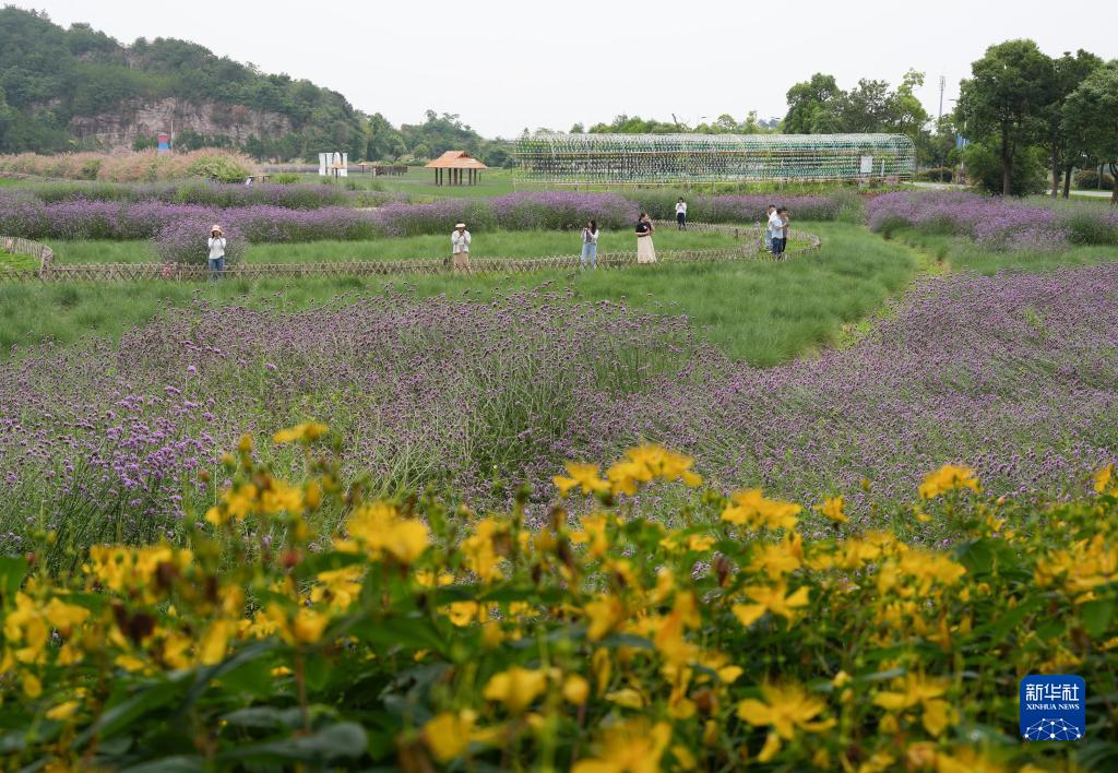 6月14日,游客在蛇蟠島的一片花海間游覽。