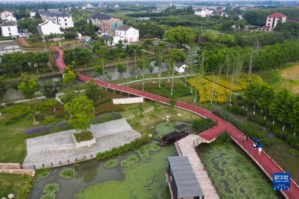 這是嘉興市南湖區鳳橋鎮聯(lián)豐村的綠道和村落景區(6月14日攝,無(wú)人機照片)。