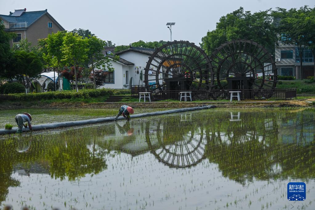 6月14日,農民在嘉興市南湖區鳳橋鎮聯(lián)豐村的稻田里插秧苗。