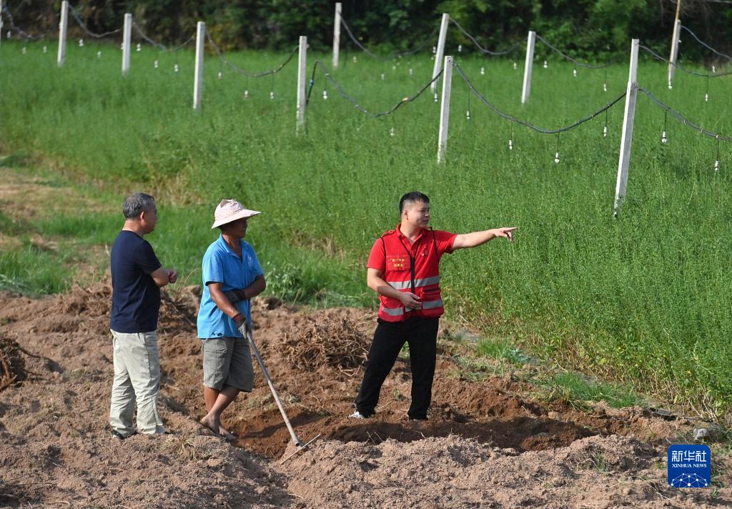 6月14日,在鹿寨縣鹿寨鎮窯上村,駐村第一書(shū)記榮雙全(右一)在蔬菜基地查看產(chǎn)業(yè)發(fā)展情況。
