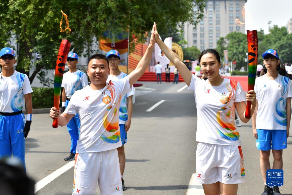 6月15日,火炬手張虹(前右)與郭子平在火炬傳遞中交接。