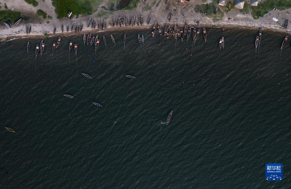 這是6月14日拍攝的坦桑尼亞姆萬(wàn)扎省維多利亞湖畔的漁船(無(wú)人機照片)。