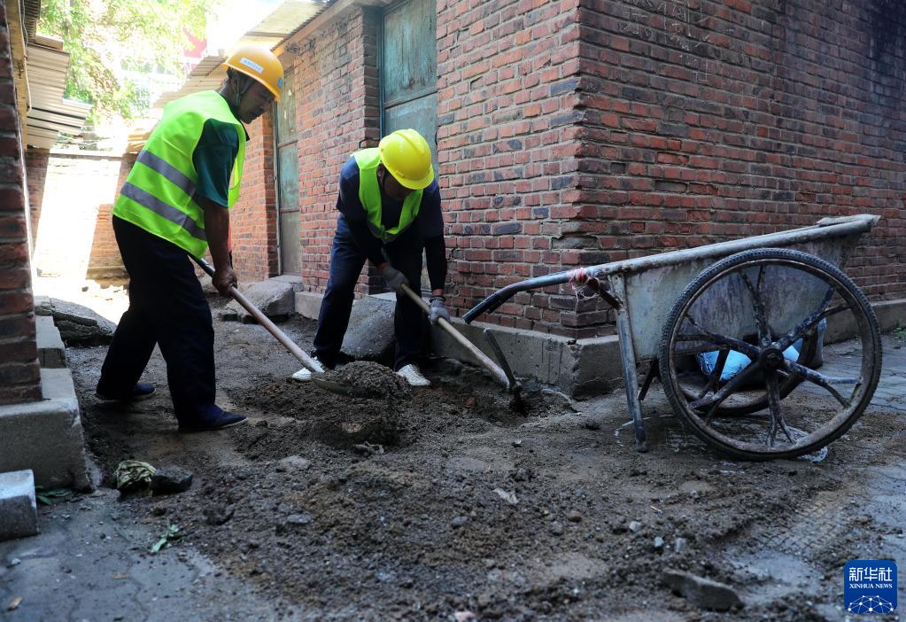6月4日,工人在秦皇島市海港區一老舊小區改造工地施工。