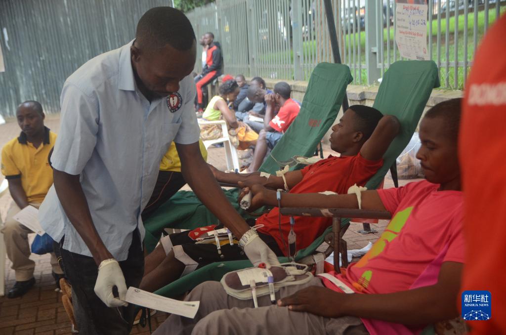 6月14日,志愿者在烏干達坎帕拉一處獻血點(diǎn)獻血。