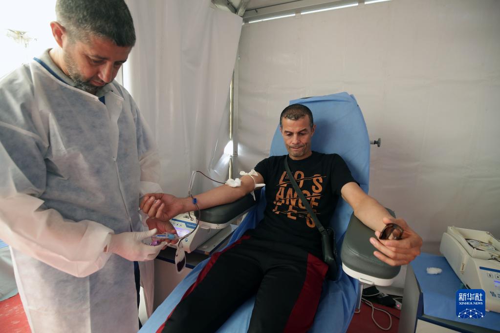 6月14日,志愿者在阿爾及利亞阿爾及爾一處獻血點(diǎn)獻血。