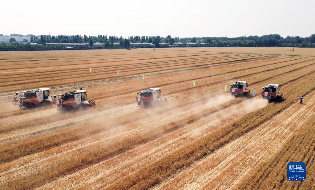 6月15日拍攝的2023年北京市小麥機收減損技能大比武現場(chǎng)(無(wú)人機照片)。