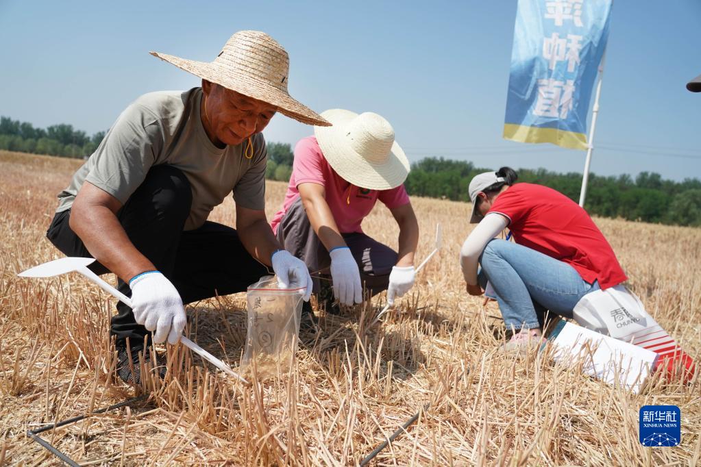 6月15日,在2023年北京市小麥機收減損技能大比武現場(chǎng),工作人員檢查參賽選手的作業(yè)質(zhì)量。