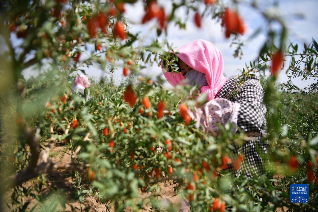 6月15日,采摘工在寧夏吳忠市紅寺堡區百瑞源枸杞種植基地采摘枸杞。