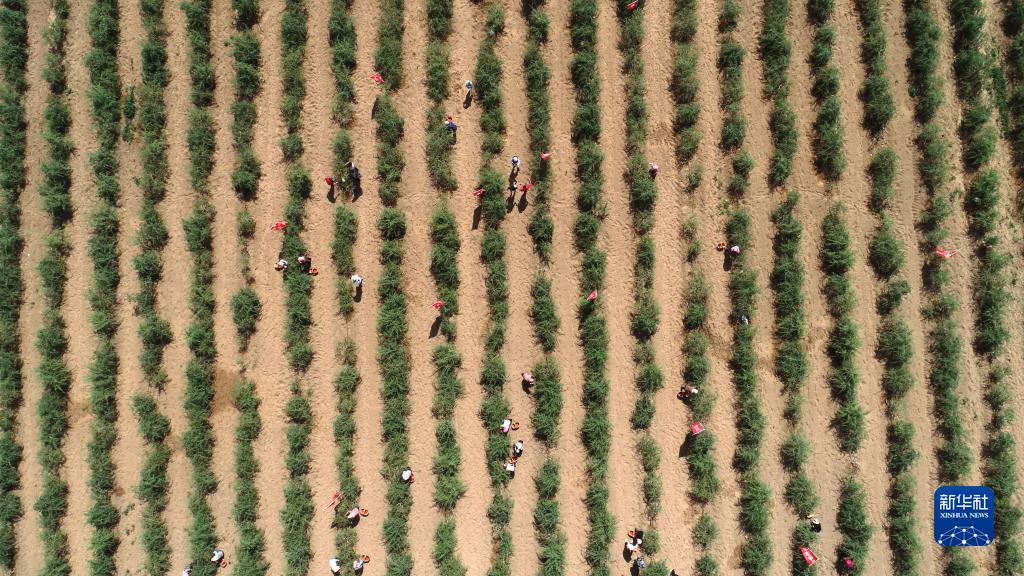 6月15日,采摘工在寧夏吳忠市紅寺堡區百瑞源枸杞種植基地采摘枸杞(無(wú)人機照片)。