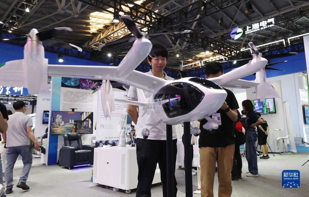 6月15日,參觀(guān)者在一架純電動(dòng)載人垂直起降飛行器模型前駐足觀(guān)看。