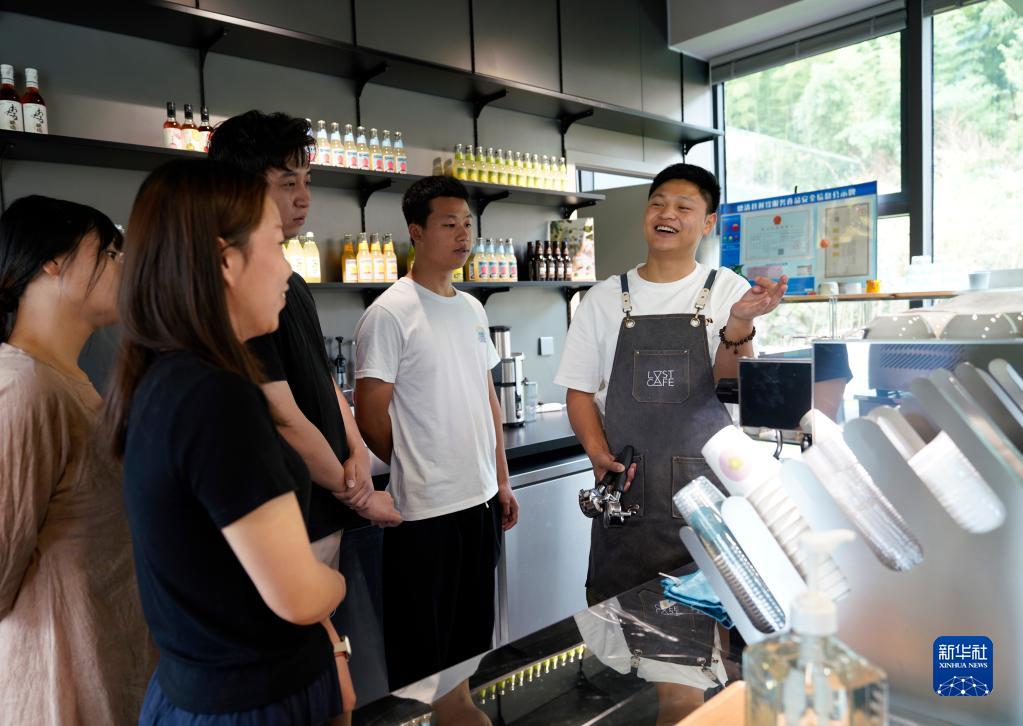 6月15日,在浙江省德清縣莫干山鎮仙潭美術(shù)館,民宿管家講師文軒(右)為仙潭村民宿管家進(jìn)行咖啡制作培訓。