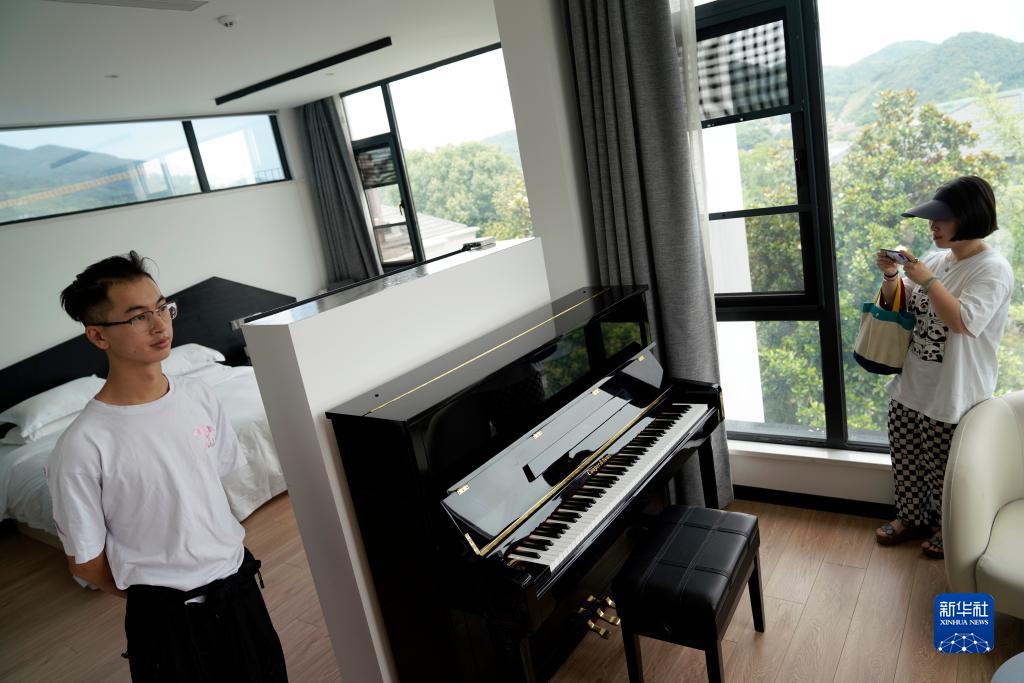 6月15日,在浙江省德清縣莫干山鎮燎原村,民宿主和民宿管家在一家音樂(lè )主題民宿參觀(guān)取經(jīng)。