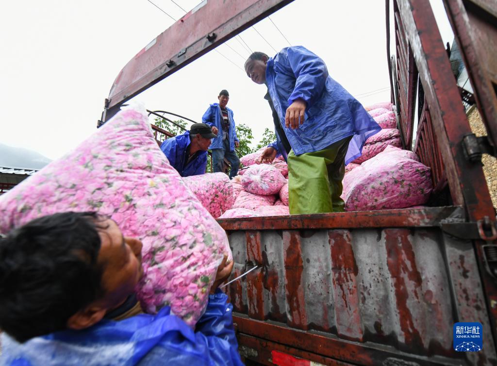 6月14日,在四川省阿壩州小金縣新橋鄉共和村,當地種植戶(hù)將售出的玫瑰鮮花裝車(chē)。
