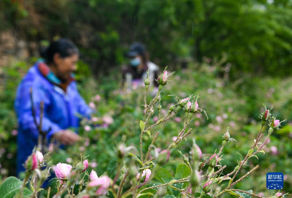 6月14日,在四川省阿壩州小金縣新橋鄉共和村,當地種植戶(hù)在采摘玫瑰鮮花。