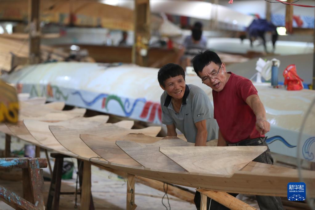 在福州市閩侯縣方莊村“龍舟世家”方忠雄龍舟廠(chǎng),兩位匠人在制造龍舟時(shí)討論(6月12日攝)。