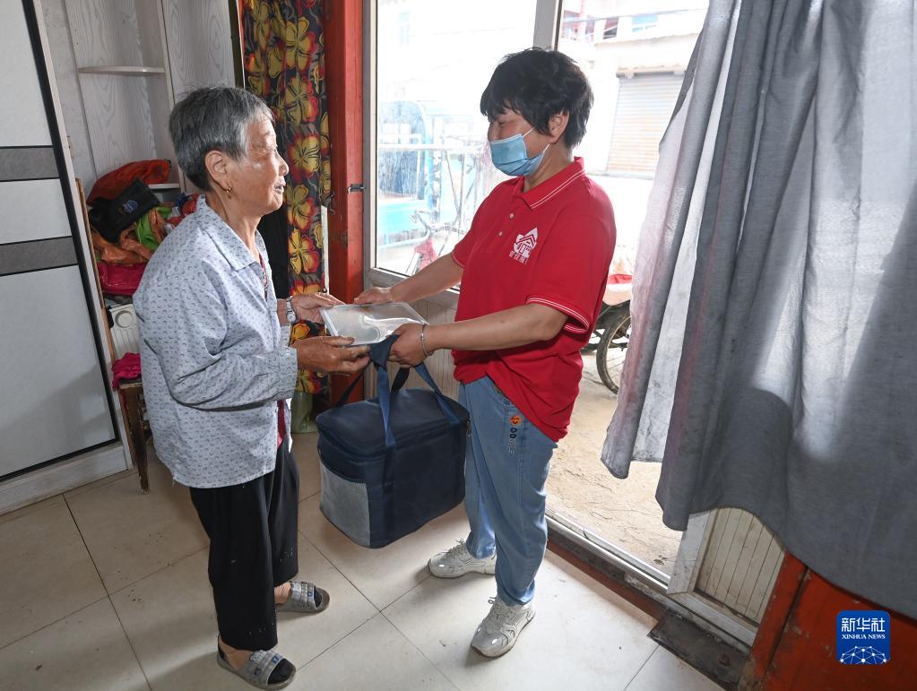 6月15日,王江涇鎮居家養老服務(wù)中心的工作人員(右)把需要配送的中餐送到老人家中。