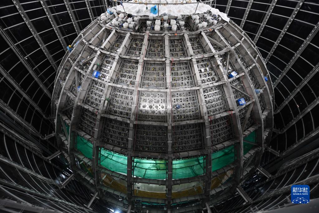 位于地下700米的江門(mén)中微子實(shí)驗探測器呈現巨大的球形結構(6月15日攝)。