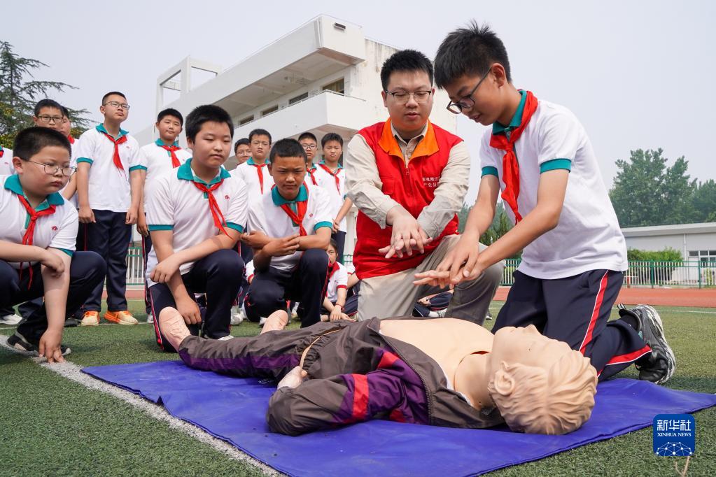 6月16日,小學(xué)生們在青年志愿者的指導下學(xué)習觸電急救技能。