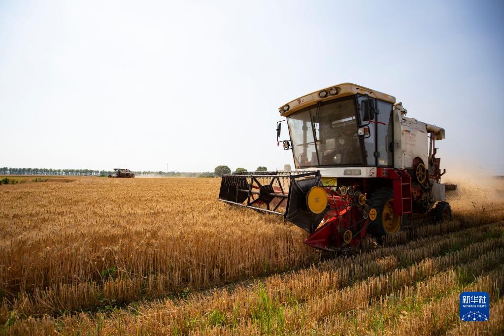 6月15日,山東省東營(yíng)市廣饒縣樂(lè )安街道北朱耿村的農民駕駛收割機收獲小麥。