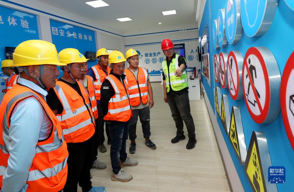 6月16日,安全員(右)向工人講解工地上的各類(lèi)警示標識。