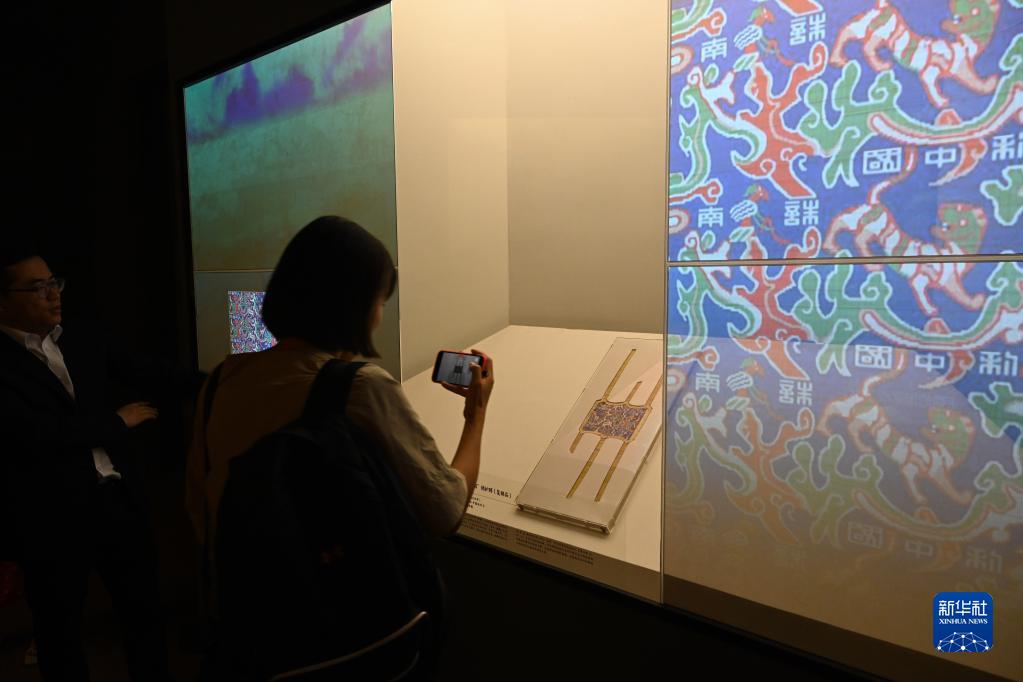 6月16日,觀(guān)眾參觀(guān)“五星出東方利中國”錦護膊(復制品)。