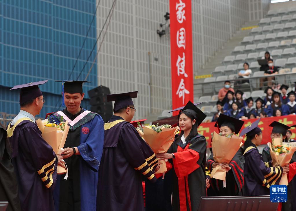 6月16日,在復旦大學(xué)2023屆研究生畢業(yè)典禮暨學(xué)位授予儀式上,畢業(yè)生代表向導師們獻花。
