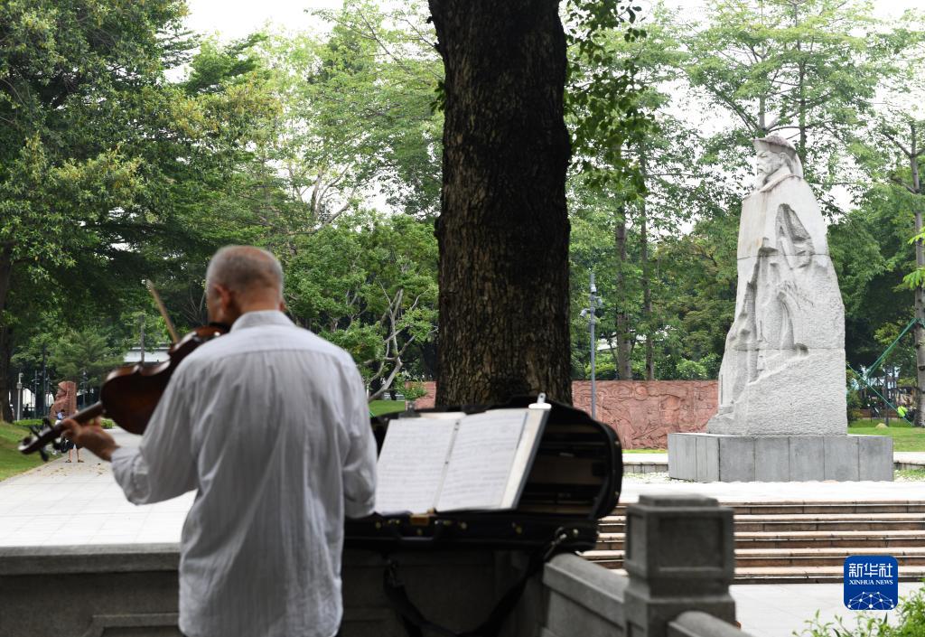 一名老人在廣州市林則徐紀念園里拉小提琴(6月13日攝)。