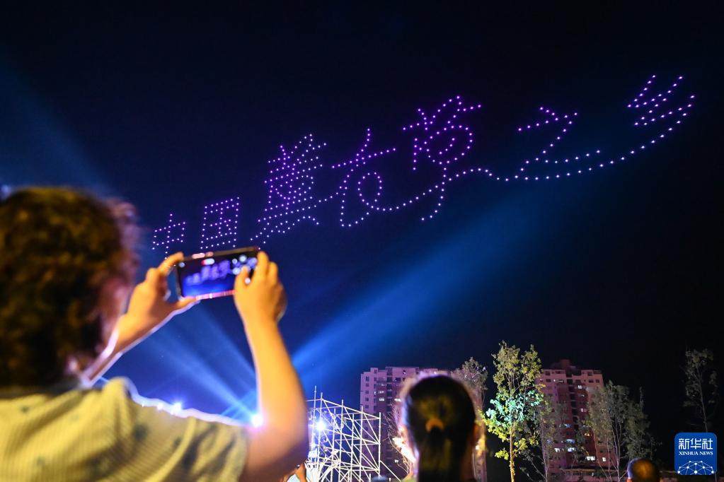 在新疆霍城縣香水體育公園,游客拍攝無(wú)人機表演(6月16日攝)。
