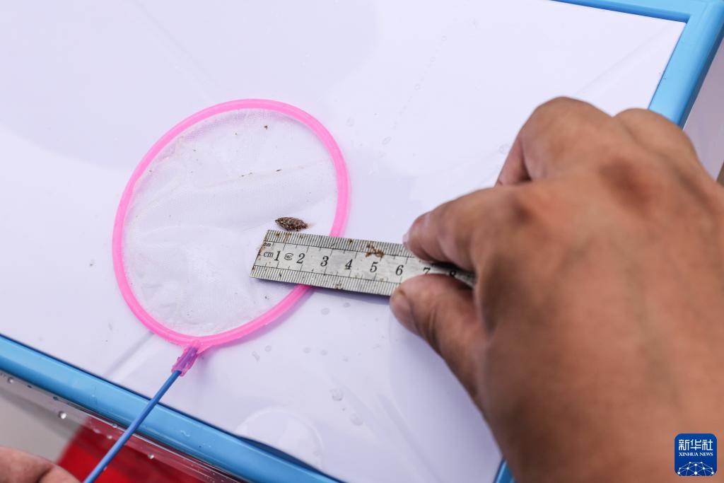 6月16日,在海南省海洋與漁業(yè)科學(xué)院瓊海長(cháng)坡科研基地,工作人員測量波紋唇魚(yú)幼魚(yú)的體長(cháng)、體高。