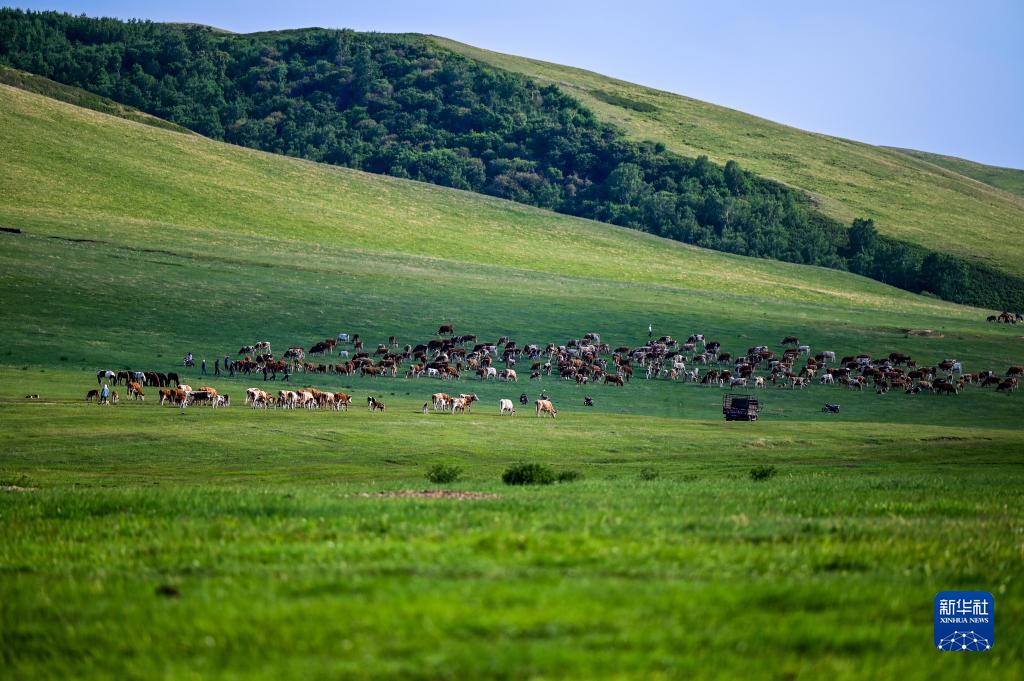 內蒙古赤峰市阿魯科爾沁草原游牧系統核心區總面積500萬(wàn)畝,南連大興安嶺,西接錫林郭勒大草原,是天然的優(yōu)良牧場(chǎng)。眼下,阿魯科爾沁旗巴彥溫都爾蘇木的夏牧場(chǎng)迎來(lái)放牧黃金季節,綠色草原綿延不絕,在牛羊、氈房的點(diǎn)綴下更加多姿多彩。
