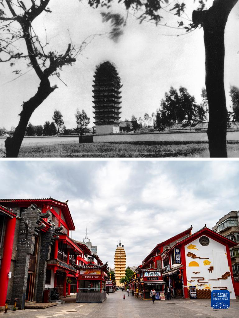 拼版照片:上圖為曾經(jīng)的西寺塔(資料圖片 殷曉俊提供)。西寺塔始建于唐代,清朝道光年間曾毀于地震,光緒年間重建。