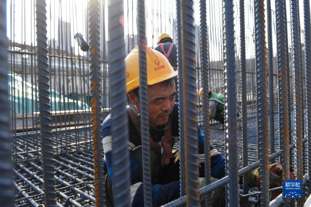 6月16日,在北京城市副中心站綜合交通樞紐項目02標段北京城建施工現場(chǎng),工人在捆扎鋼筋。為了應對高溫天氣,工地已調整作息時(shí)間,施工時(shí)間避開(kāi)了中午高溫時(shí)段。