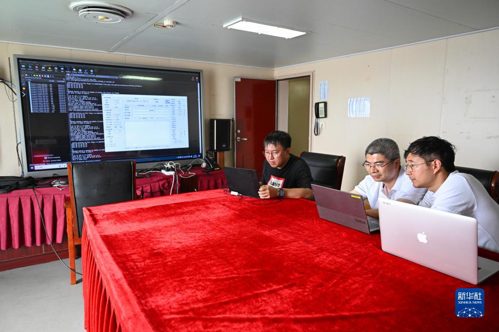 工作人員在“電科1號”綜合試驗船上驗證高低軌衛星、無(wú)人機協(xié)同通信覆蓋能力(6月15日攝)。