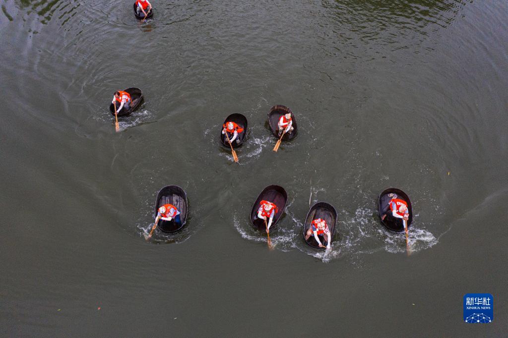 6月17日,村民們劃著(zhù)菱桶在水面上參加比賽(無(wú)人機照片)。