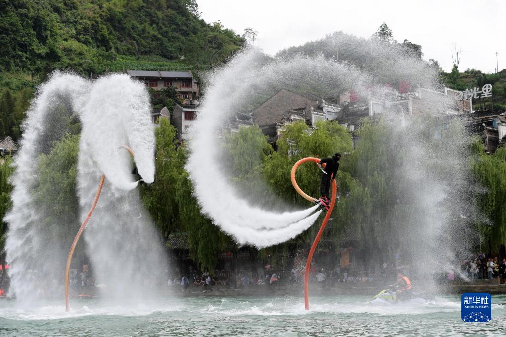 6月17日,工作人員在鎮遠古城?陽(yáng)河畔進(jìn)行水上飛人表演。