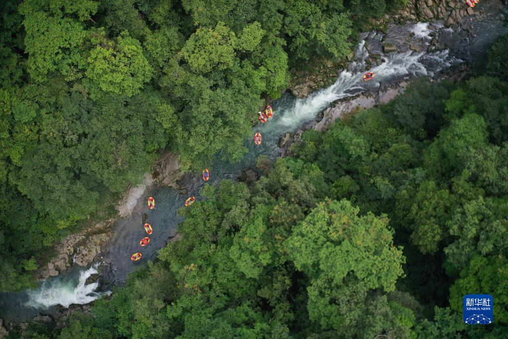 6月17日,游客在鎮遠縣高過(guò)河景區漂流(無(wú)人機照片)。