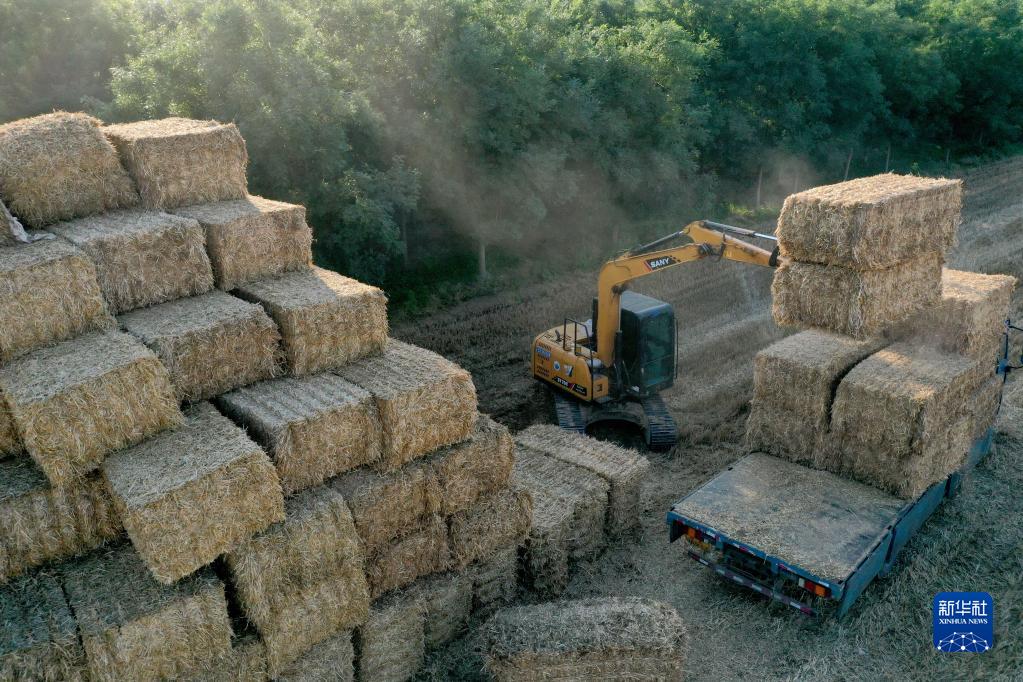 6月17日,河北邢臺南和區閻里鄉大郝村農民將打捆的秸稈碼垛存放(無(wú)人機照片)。