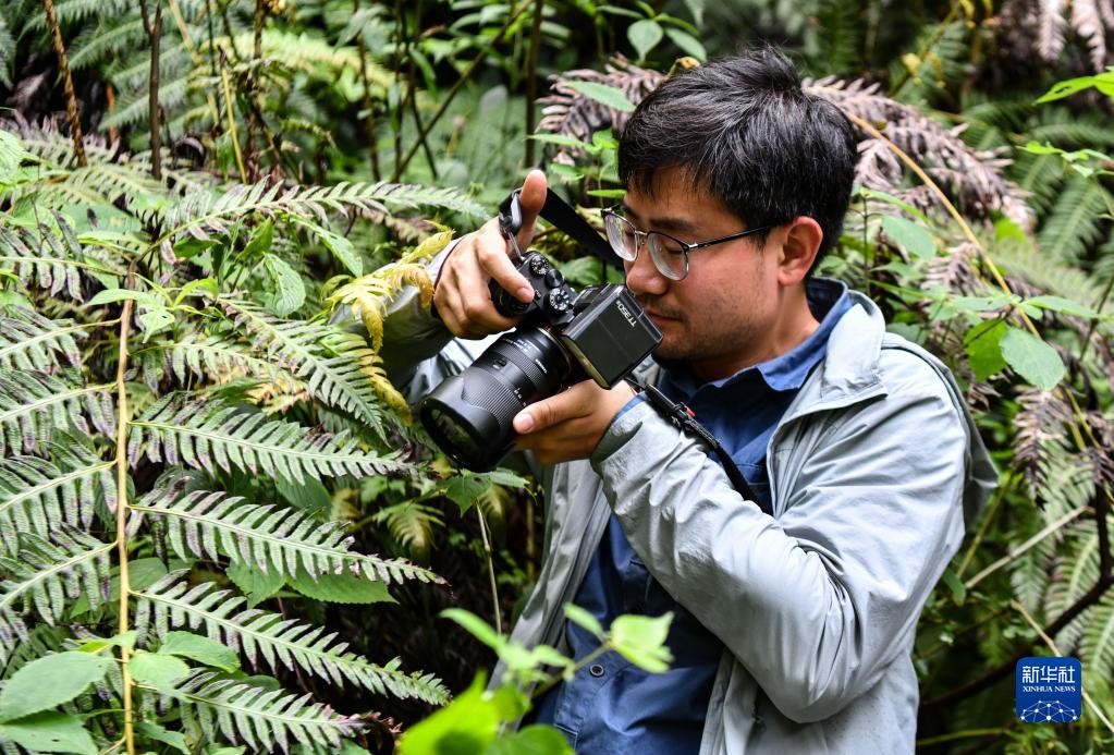6月15日,中科院植物所博士生王孜在亞洲第一高樹(shù)旁拍攝一株西藏柏木的小樹(shù)苗。新華社記者 晉美多吉 攝