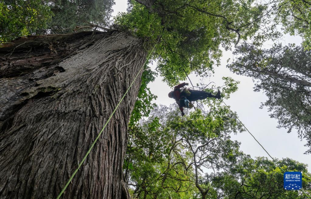 6月15日,攀樹(shù)專(zhuān)家劉團璽在攀爬亞洲第一高樹(shù)。新華社記者 費茂華 攝