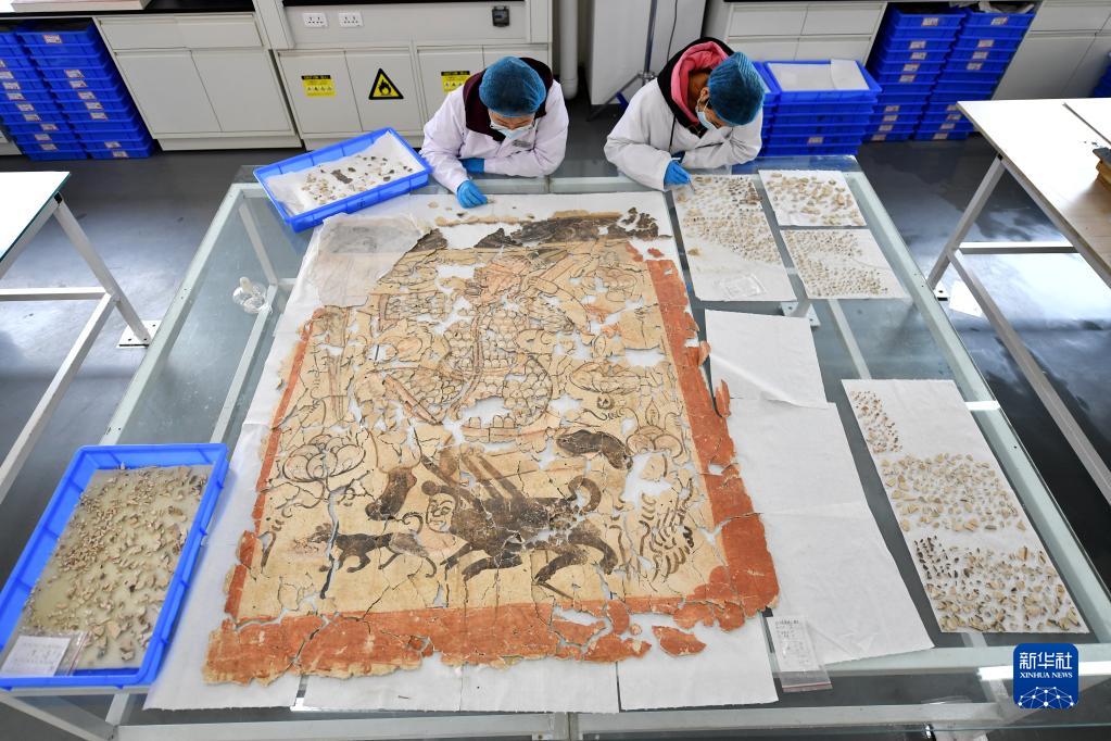 在山西大同云岡石窟研究院壁畫(huà)文物修復室,工作人員在進(jìn)行壁畫(huà)修復(2021年5月9日攝)。
