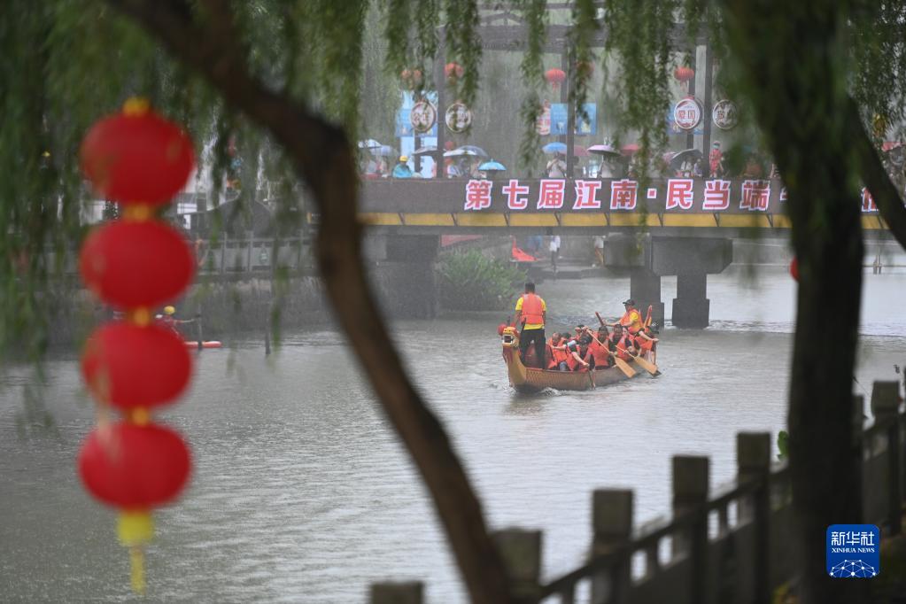當日,浙江省湖州市“我們的節日·端午”暨第七屆江南·民當端午民俗文化旅游節在南潯區和孚鎮民當村開(kāi)幕,來(lái)自南潯區各個(gè)鄉鎮的農民選手在河道中賽龍舟、劃菱桶,體驗傳統端午民俗。