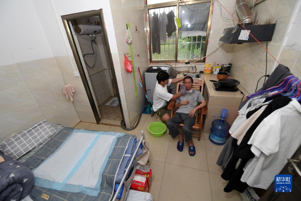 6月17日,在廣西南寧,袁東旺在學(xué)校附近的出租房里幫父親洗臉。