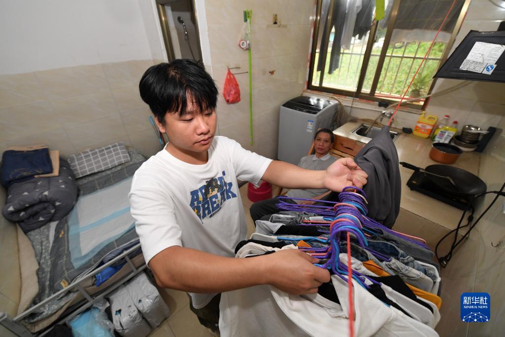 6月17日,在廣西南寧,袁東旺在學(xué)校附近的出租房里掛衣服。