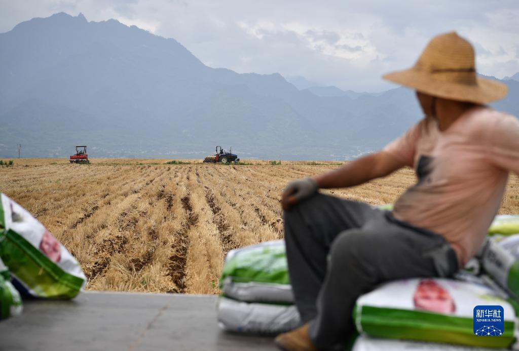 6月16日,長(cháng)豐農機專(zhuān)業(yè)合作社的社員們在西安市長(cháng)安區神禾塬萬(wàn)畝優(yōu)質(zhì)糧食生產(chǎn)基地內播種玉米。