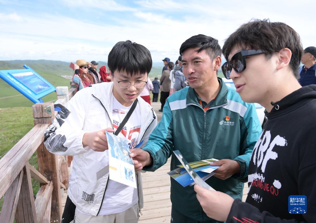 哈弄奪機(中)在若爾蓋縣黃河九曲第一灣景區向游客發(fā)放郵政明信片,宣傳介紹當地旅游資源(6月15日攝)。