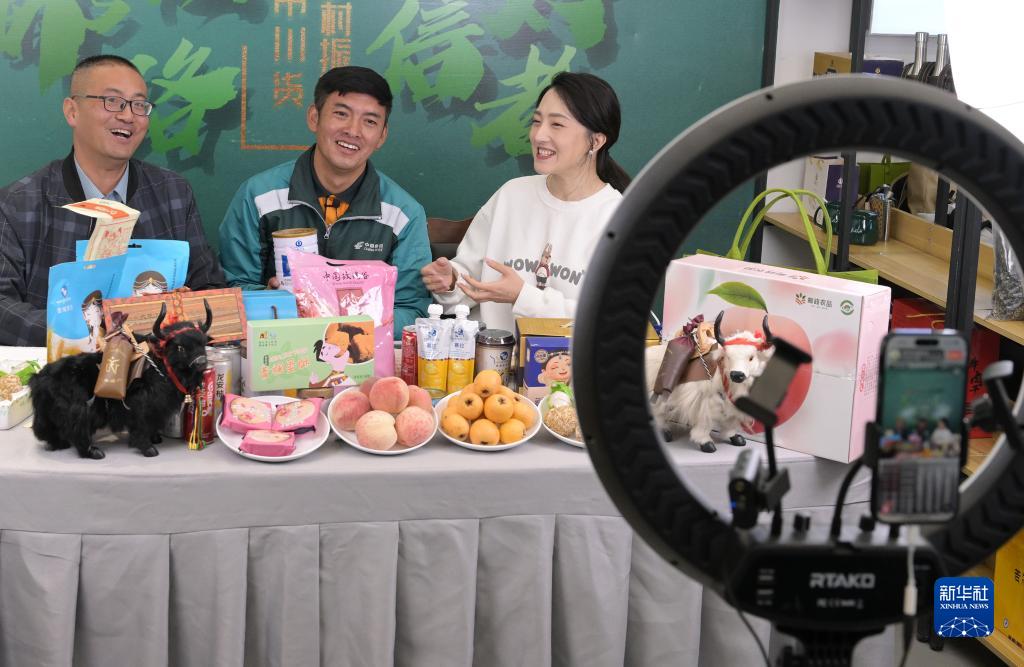哈弄奪機(中)在郵政電商工作室為牦牛肉干、糌粑等當地物產(chǎn)直播帶貨(6月17日攝)。